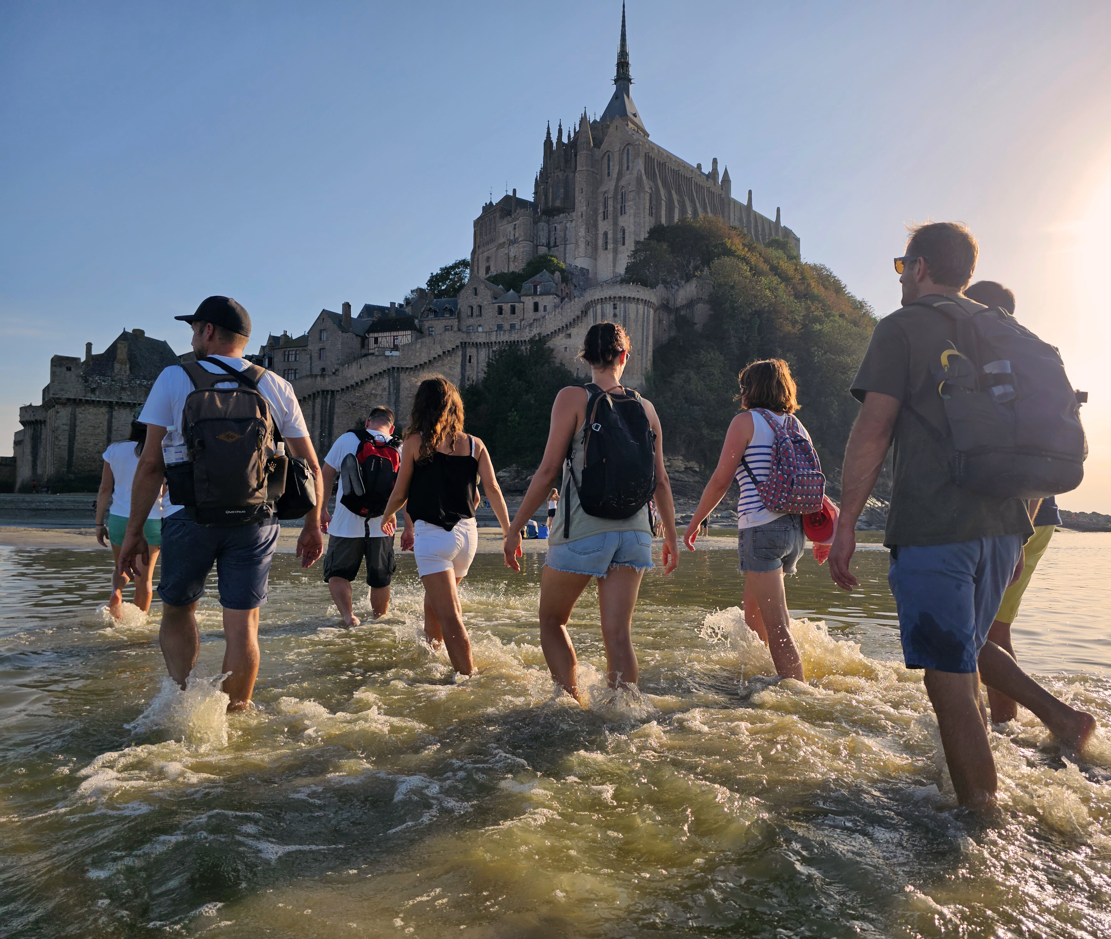 Les pieds nus dans le sable et la vase nous partons à la découverte des sables mouvants, nous traversons des rivières le tout en profitant du coucher de soleil. De nuit, le retour en direction du Mont Saint-Michel éclairé est l’assurance d’une expérience inoubliable.